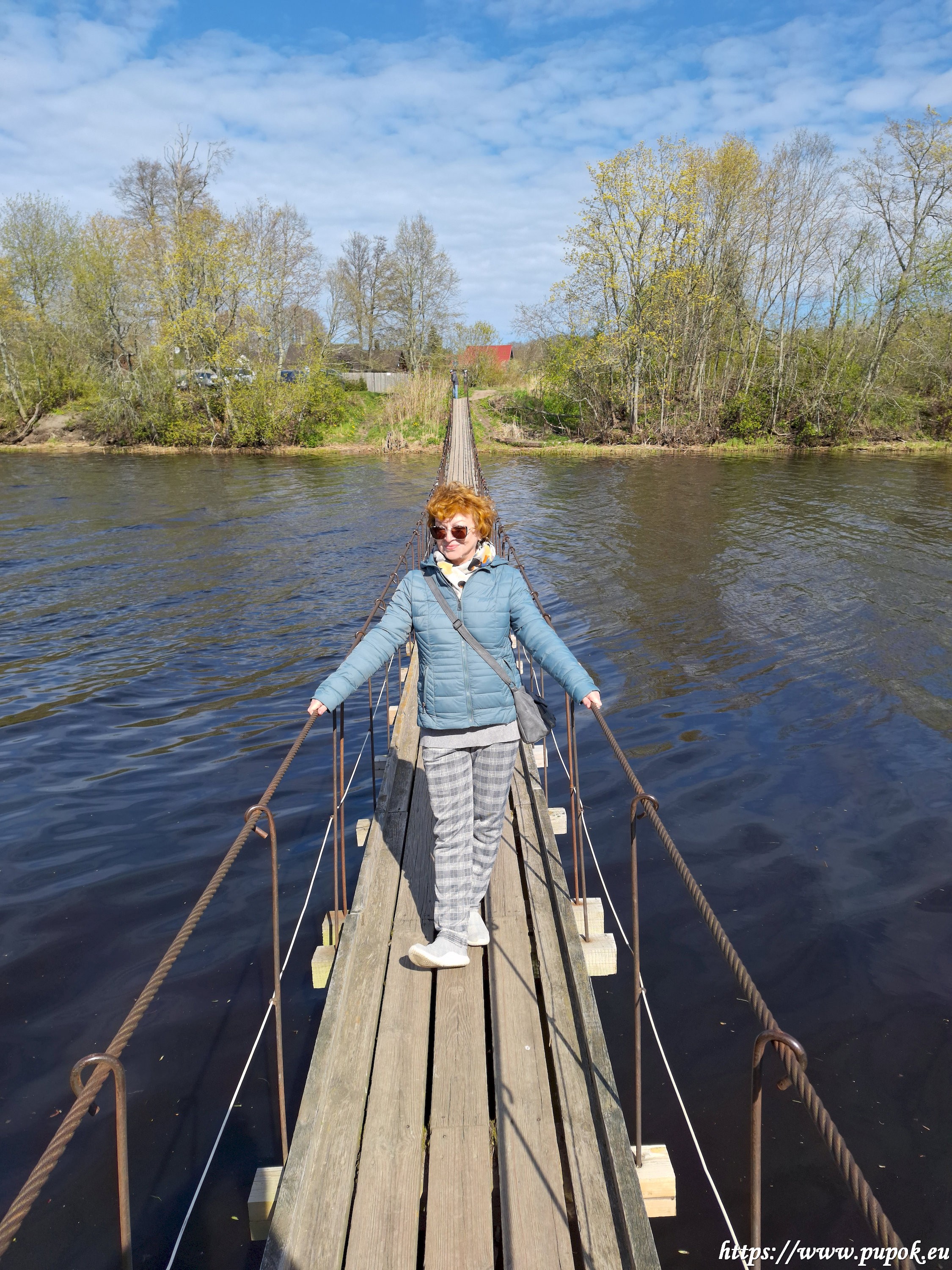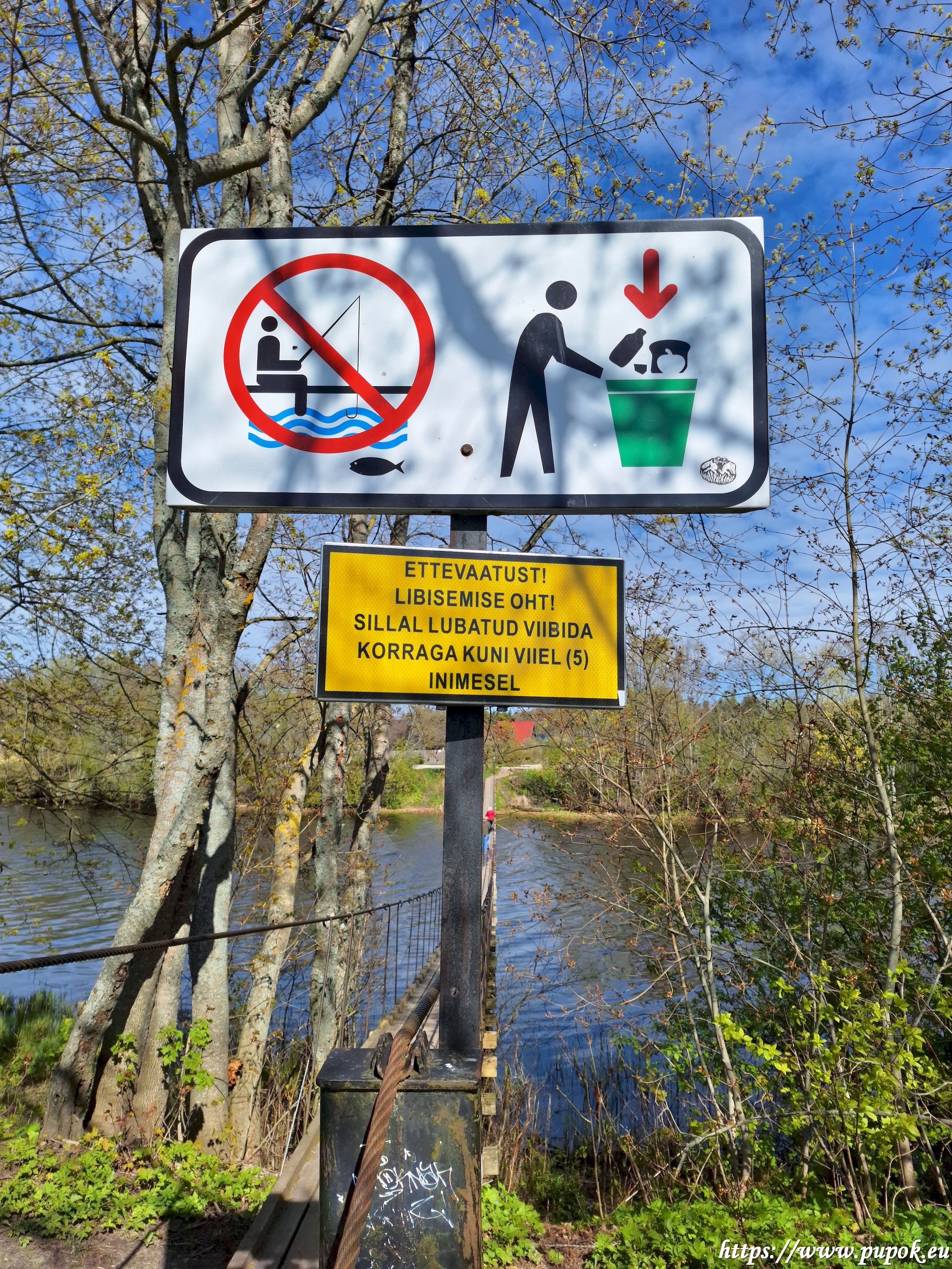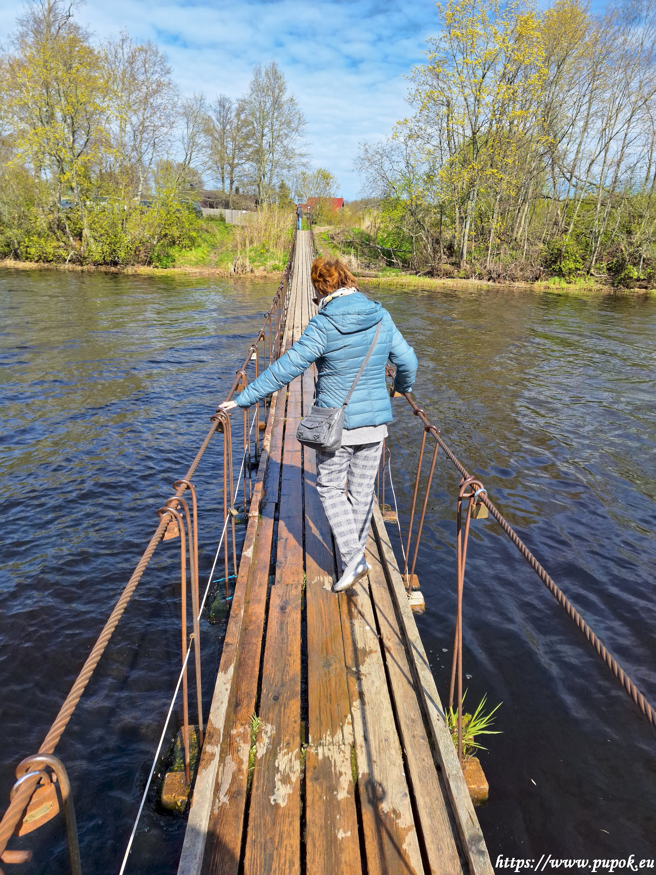 А это мы добрались до висячего (подвесного?) моста в Ягала — Jägala rippsild. Наc, конечно, не 5 человек … но я точно потяну за двоих. Мост так хитро закреплен, что его середина под весом людей активно шлепает по поверхности воды.