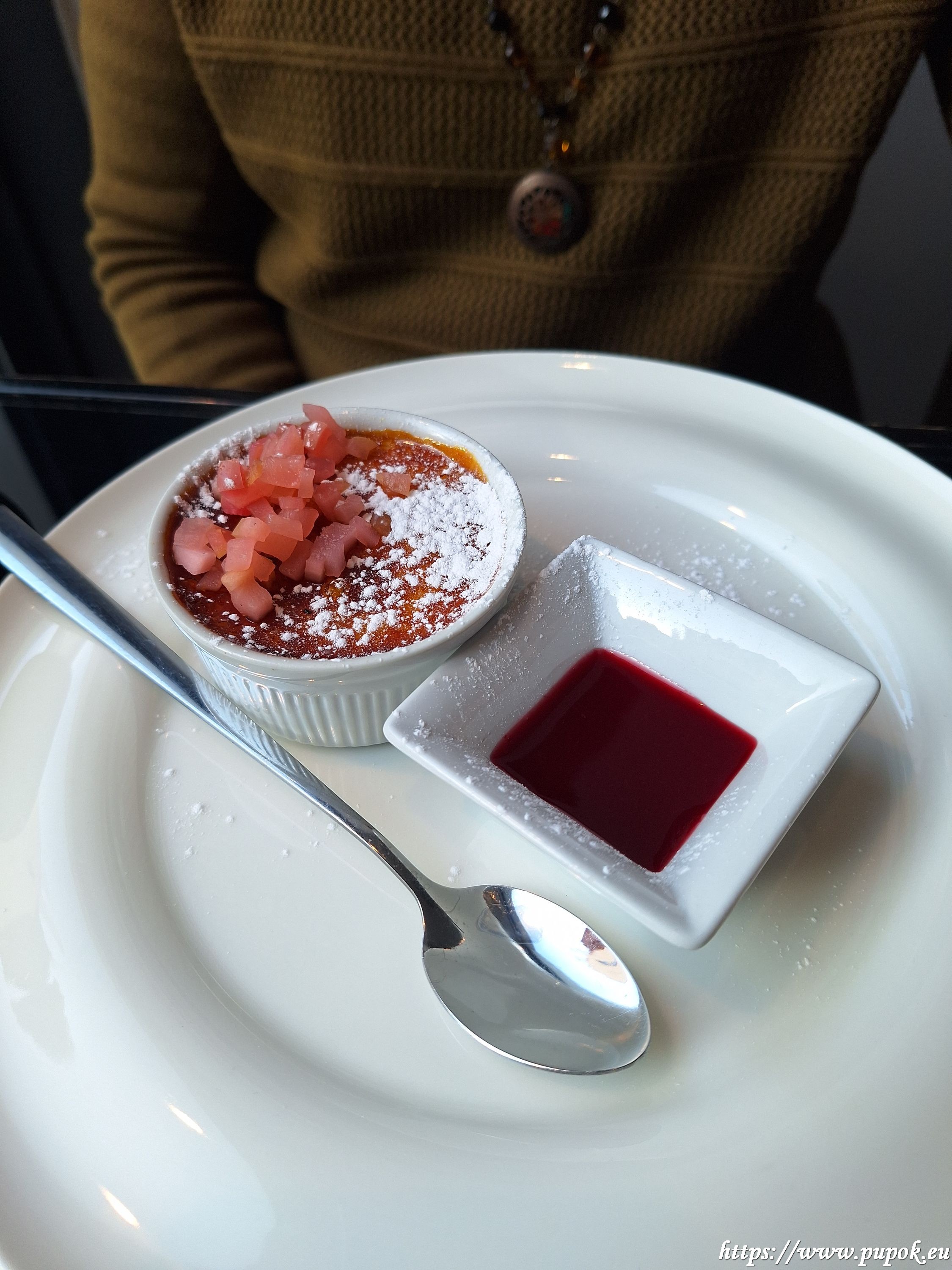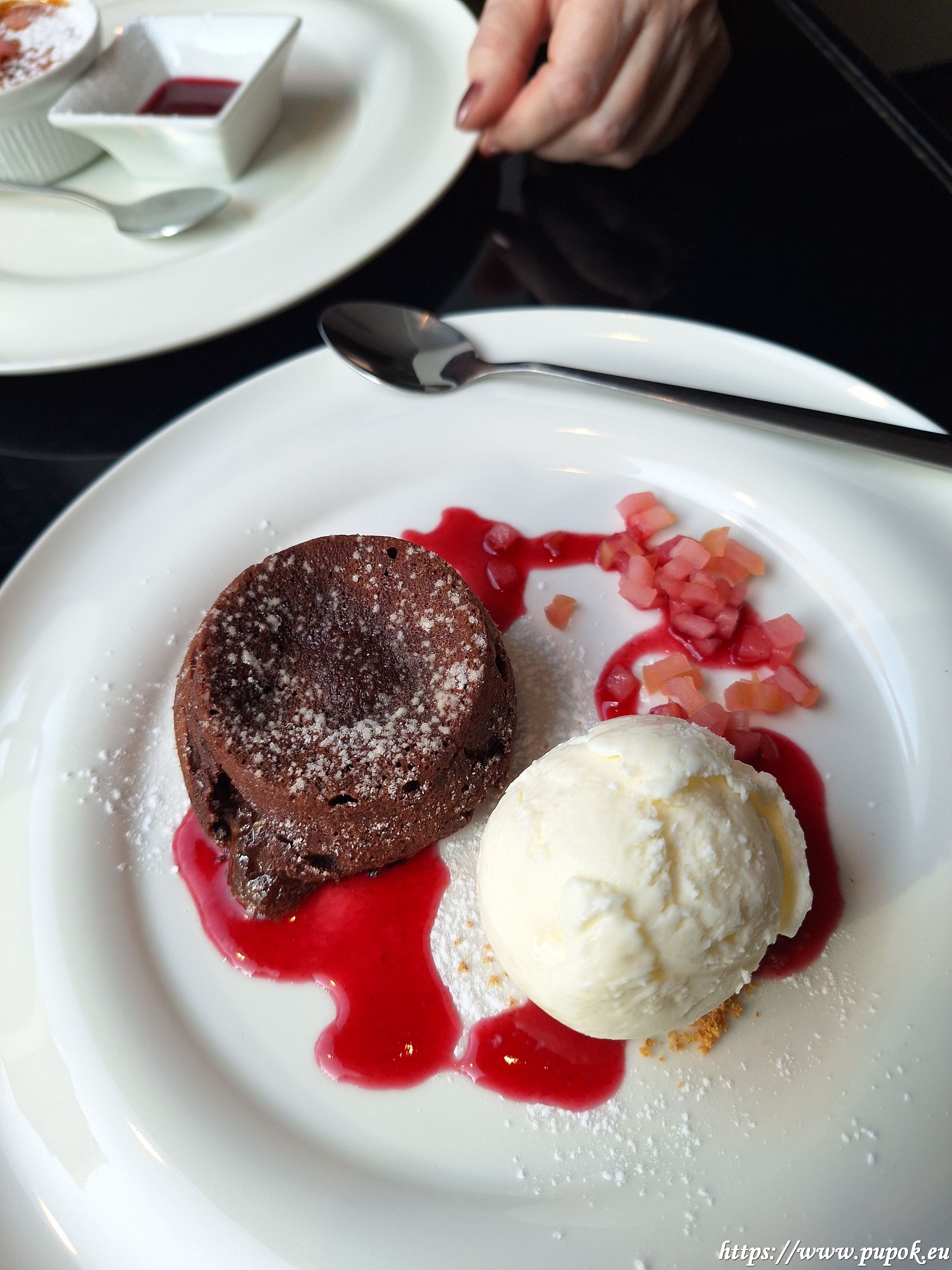 «Traditional chocolate lava cake with ball of ice cream» — Fondant au chocolat. «Traditional Creme Brulee». Ну и традиционный кофе.