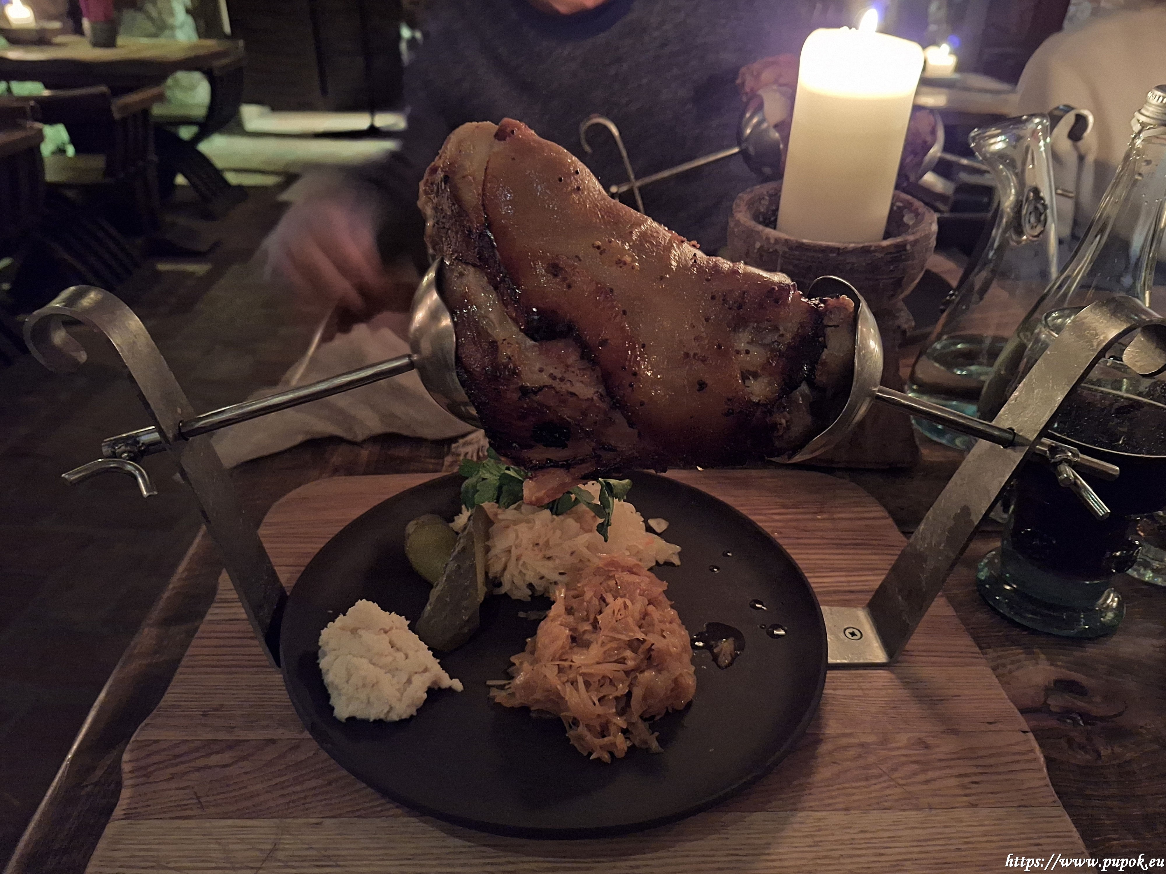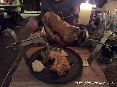 Мужская еда: Свинная рулька € 27.00. На вертеле, с двумя видами пикантной капусты и хреном домашнего приготовления, разжигавшим аппетит. Этим блюдом могли насытиться 2 всадника. Не знаю, как там тогда ели какие-то всадники. Нам как раз хватило, в один организм — одна рулька.
