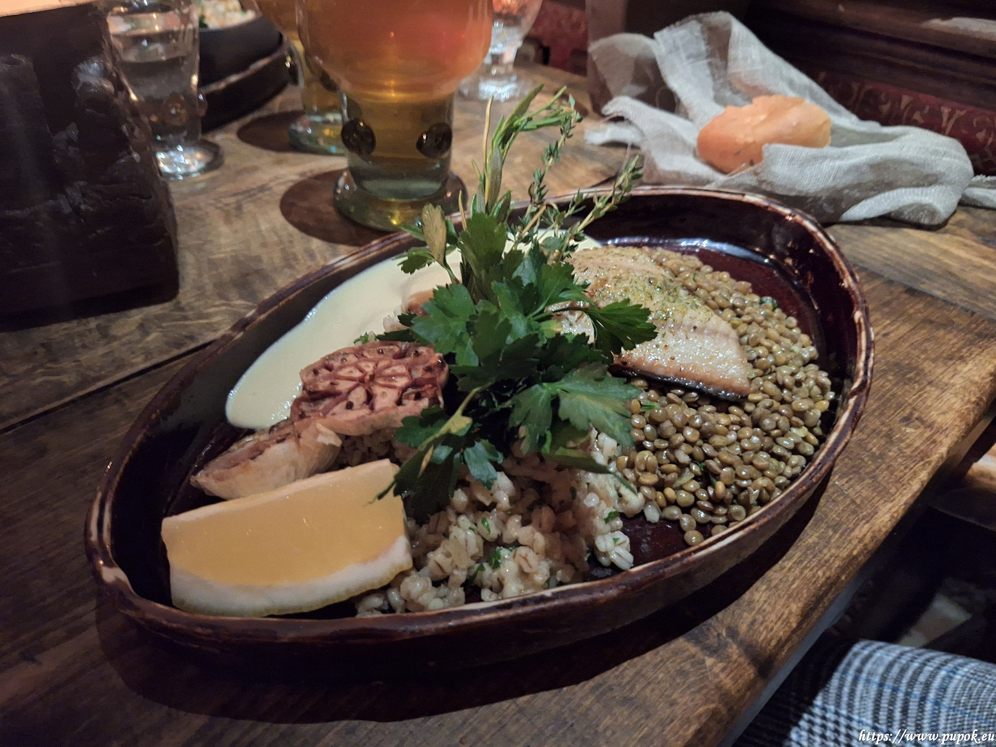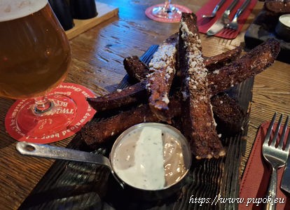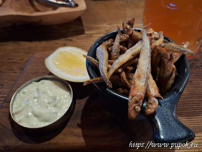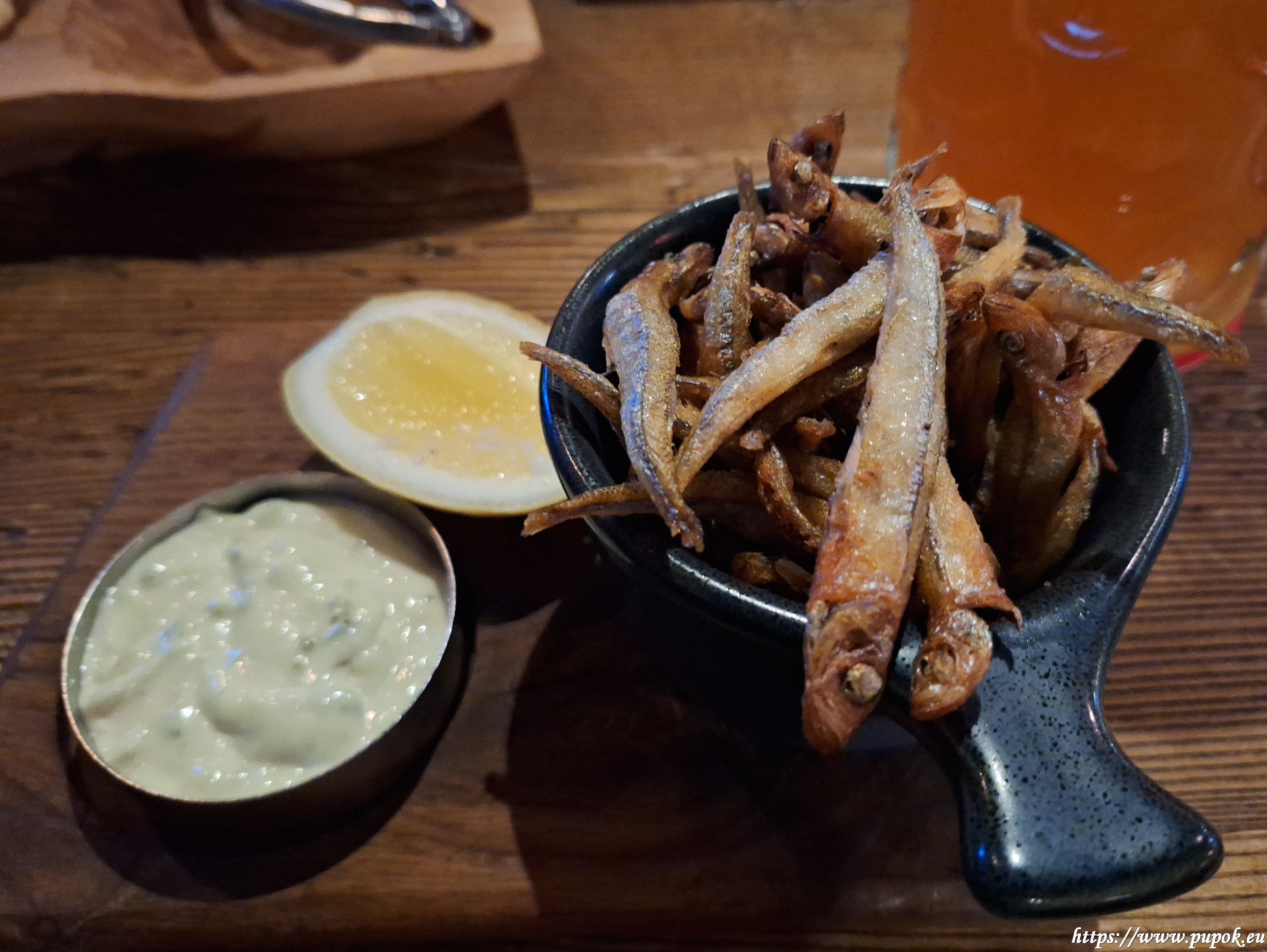 Корюшка точь в точь, как наш снеток из Чудского озера. Возможно, это и есть такая же рыбка, ибо тут в меню написано «корюшка», а снеток — это просто форма (разновидность) европейской корющки. В любом случае, обалденно вкусно! Одной этой рыбки к пиву достаточно, чтобы приехать в Ригу и прийти в этот паб.